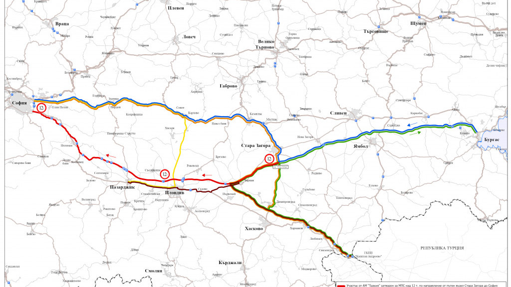 - За пътуващи от ГКПП „Капитан Андреево“ в посока гр. Бургас - АМ „Марица“ до п. в. „Димитровград“ при км 35+888 по път I-5 до п. в. „Стара Загора“ при км 208+181 на АМ „Тракия“ – гр. Бургас;
